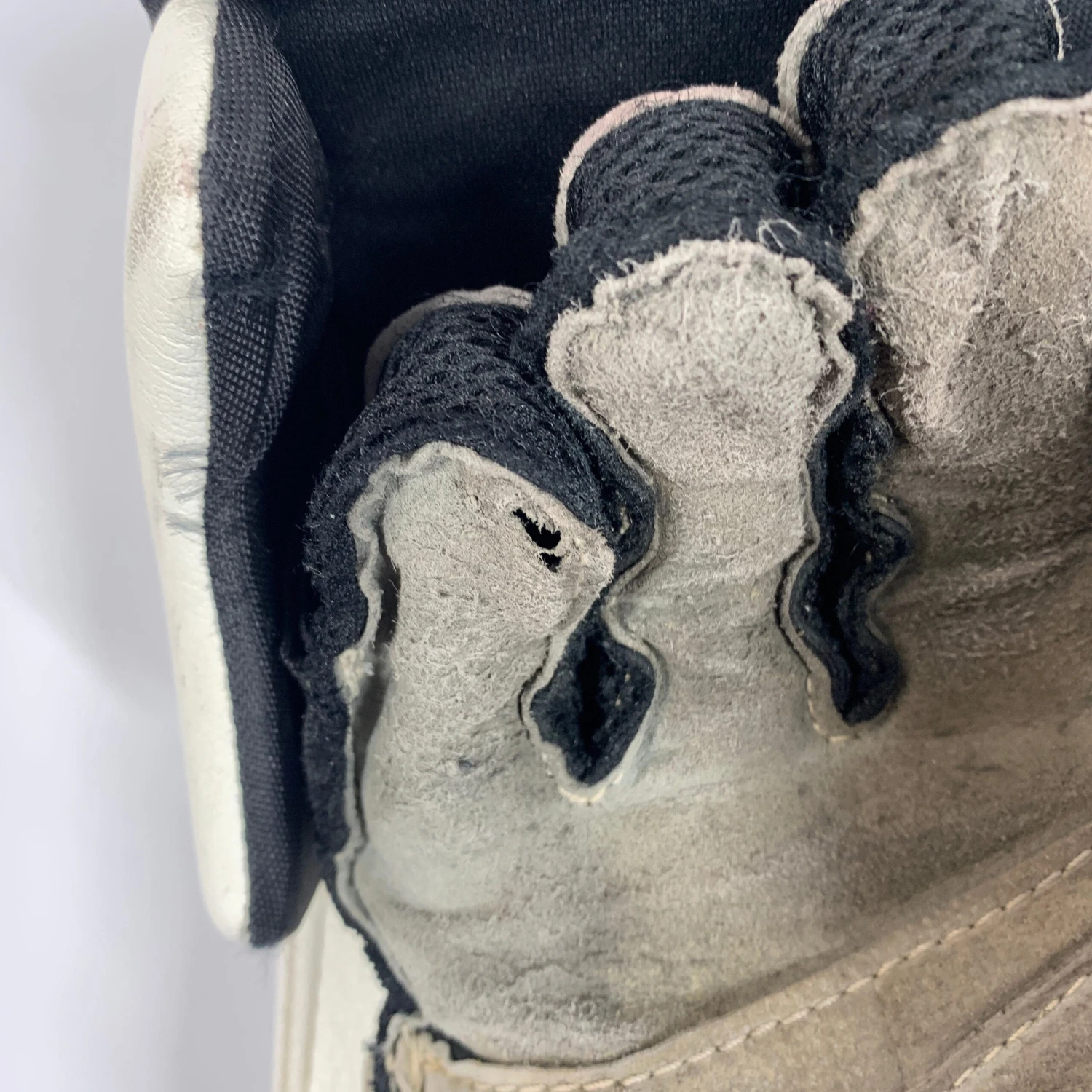 This glove is in good used condition with general wear and puck marks to show a fair amount of use. There is some small bubbling on the left outer edge towards the front of the blocker and a few small holes through only one layer of the palm. Priced according to condition this is a good glove for a part time goalie or someone looking to save money on equipment.