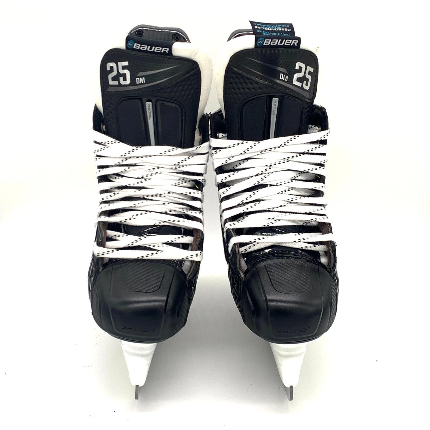 These skates have “25 DM” custom printed on each tongue.