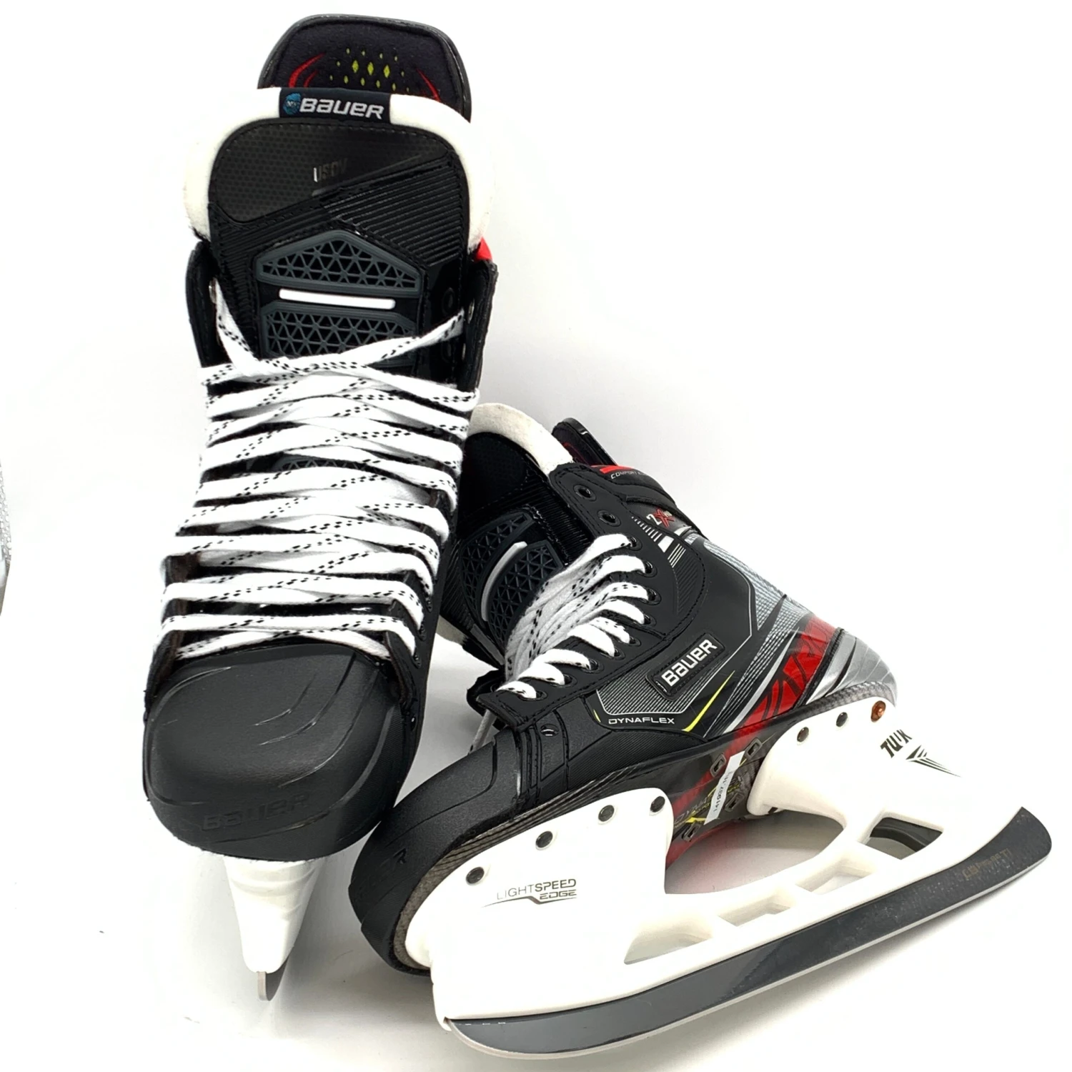 New Pro Stock Bauer Vapor 2X Pro Skates from a CHL team. Left size 11D right size 10.5D with 296 Lightspeed Edge holders and LS Pulse TI Steel. These skates have “USOV” custom printed on the tongue.
