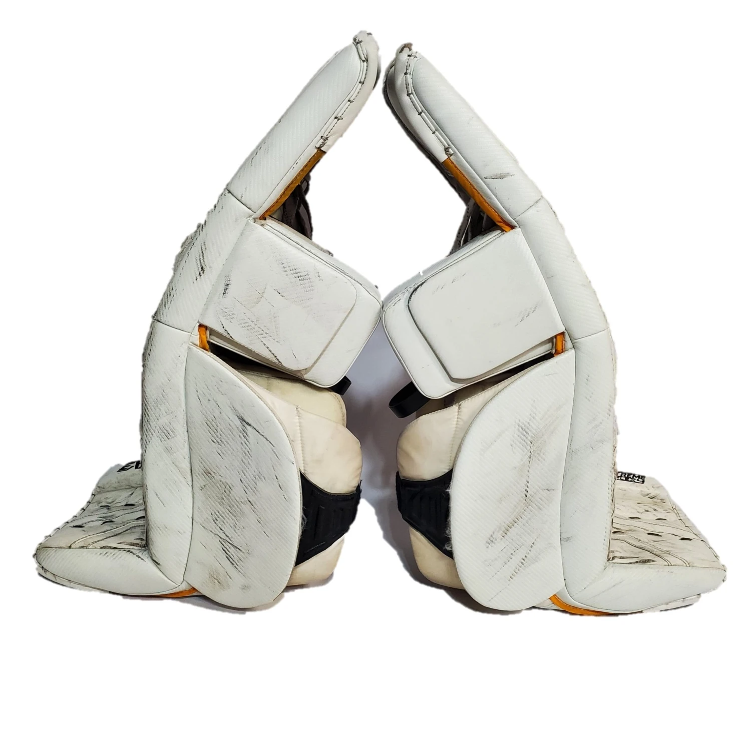 Used CCM Extreme Flex IV leg pads from an OHL team. White/Yellow/Black. Pads are in used condition with wear/fraying in typical areas and a cut on the front of the left pad (pictured). All straps/velcro are in good shape and work well. Leather is nice and soft.
