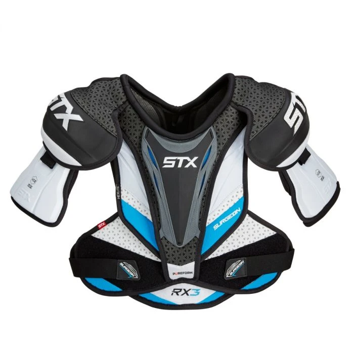 Play with Power using the STX RX3 Ice Hockey Shoulder Pads. These pads are made to meet the demanding needs of elite players. They feature a tapered fit with low profile lightweight mobile protection. Equipped with Next generation flexible protection Poly-Morph material you can be sure to find comfort and protection with the RX3. The upper torso and rib protection are independently designed and connected with stretch gussets allowing for better mobility without creating gaps in protection. High definition foam located throughout the pad creates a hydrophobic barrier that repels sweat and water resulting in a pad that stays dry all game long.